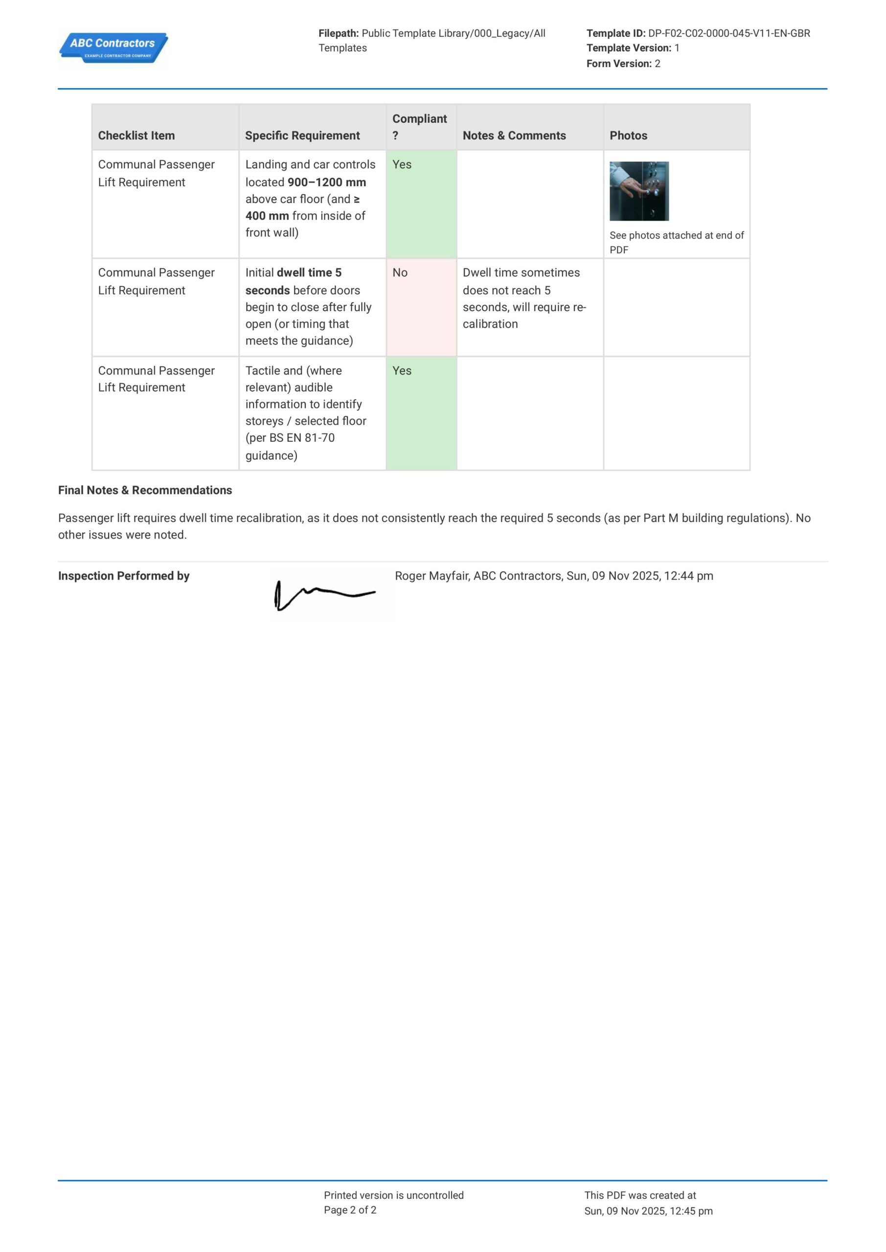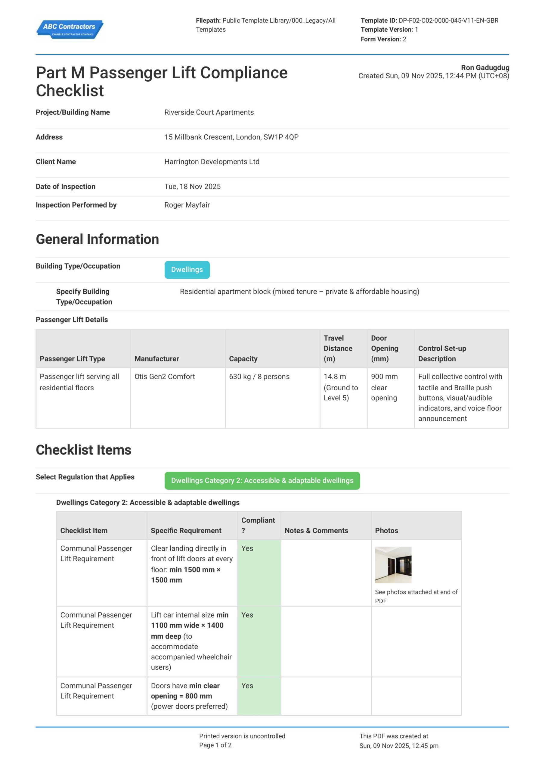Part M Passenger Lift Compliance Checklist Template