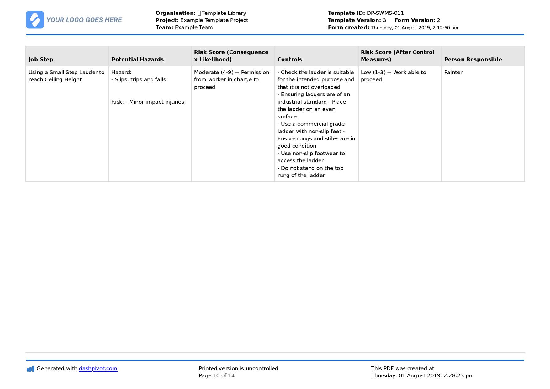 - Download, print or share any of your safe work method statements as formatted PDF documents with your company logo and colours.