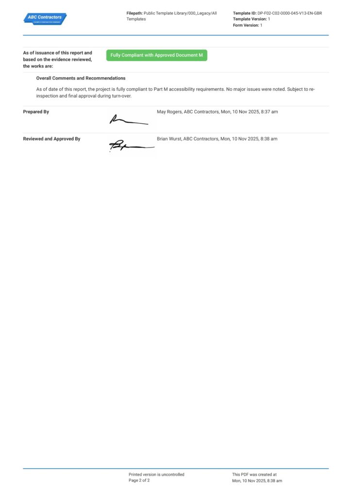 One sure fire way to show you’re building according to Approved Document M regulations is to create a compliance report focused on accessibility. A compliance report would allow you to list down all instances of compliance, based on the regulations set out in the UK Part M document itself. We’ve prepared a sample you can browse in the preview below to give you a better idea on what a good compliance report is formatted.