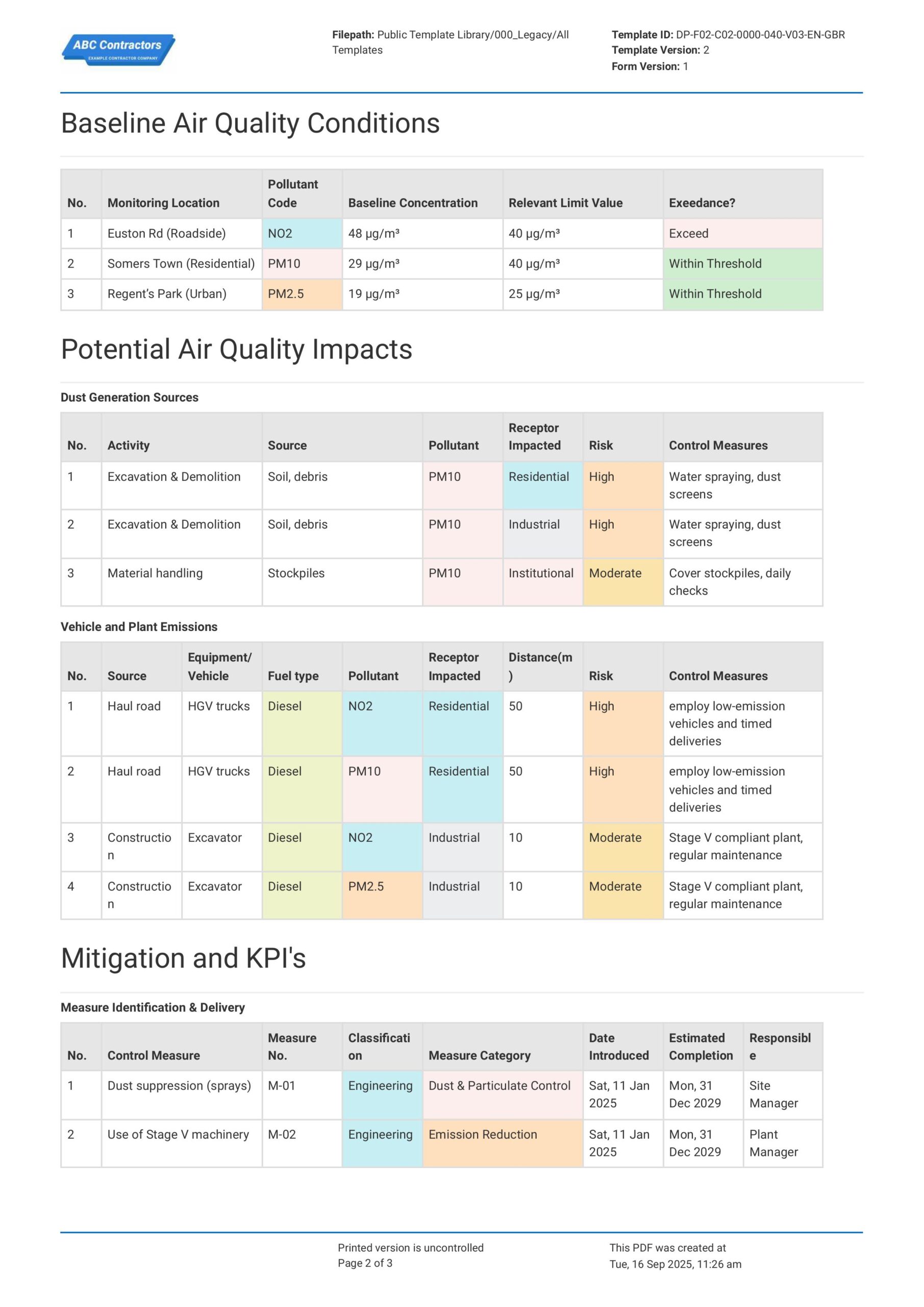 The HS2 Air Quality Action Plan template is useful because it follows HS2 compliance requirements and established best practices for air quality management. It provides a clear structure for documenting project details, monitoring air quality risks, and recording control measures, making it easy for teams of any size to stay compliant and consistent.