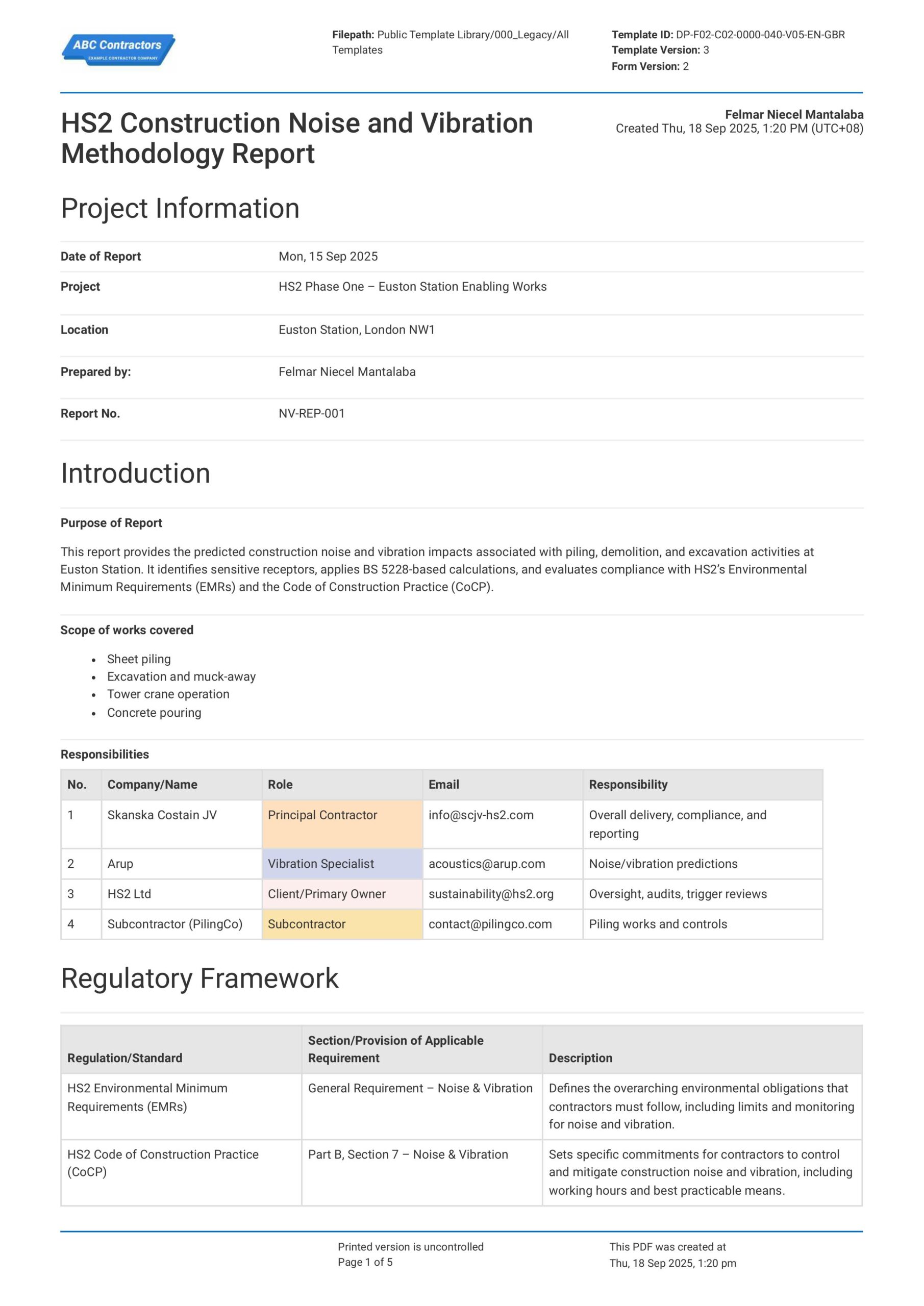 Use this HS2 Construction Noise and Vibration Methodology Report template for free.