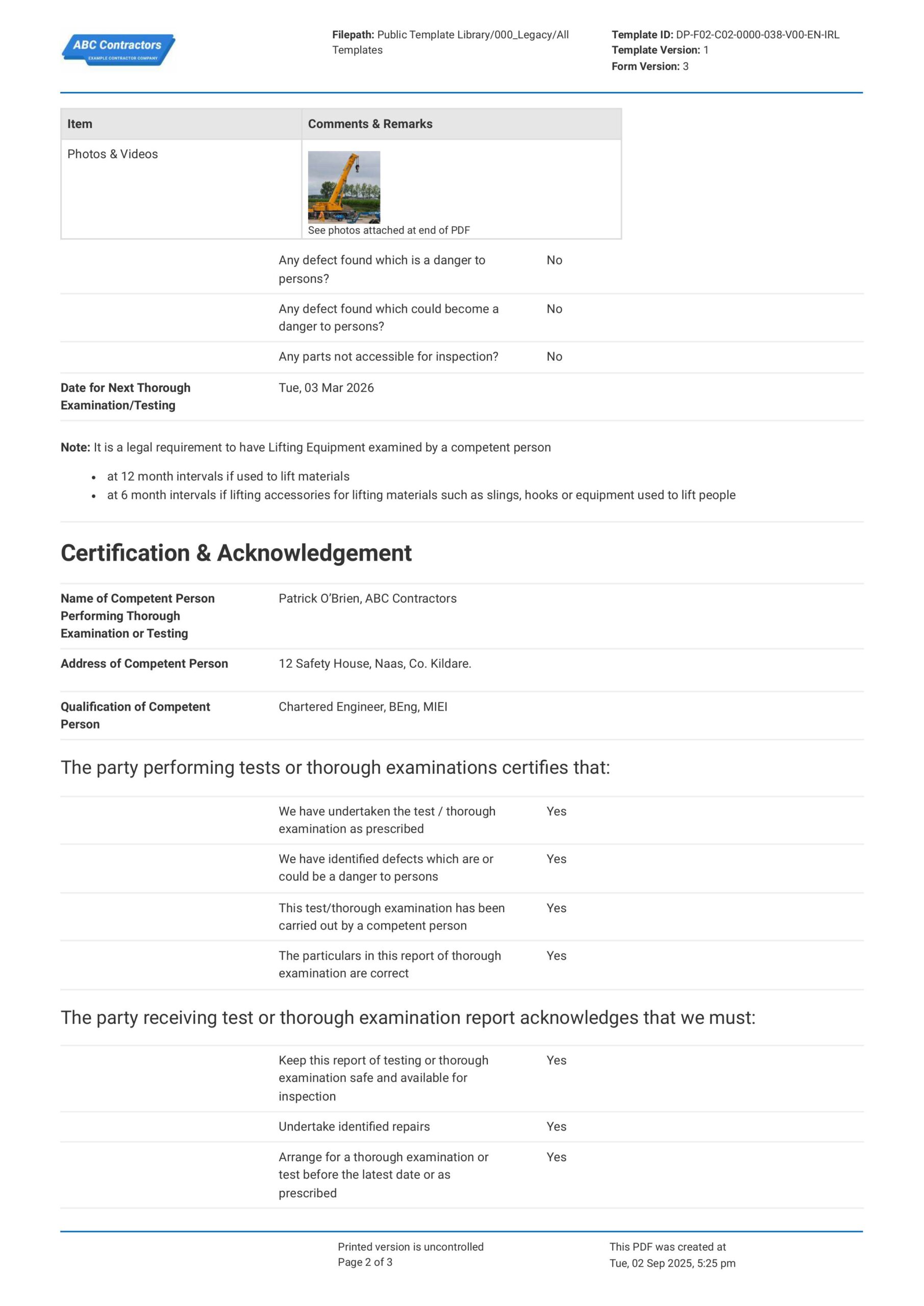 - Next due date for a thorough examination – 6 month intervals if used to lift people, 12 month intervals otherwise