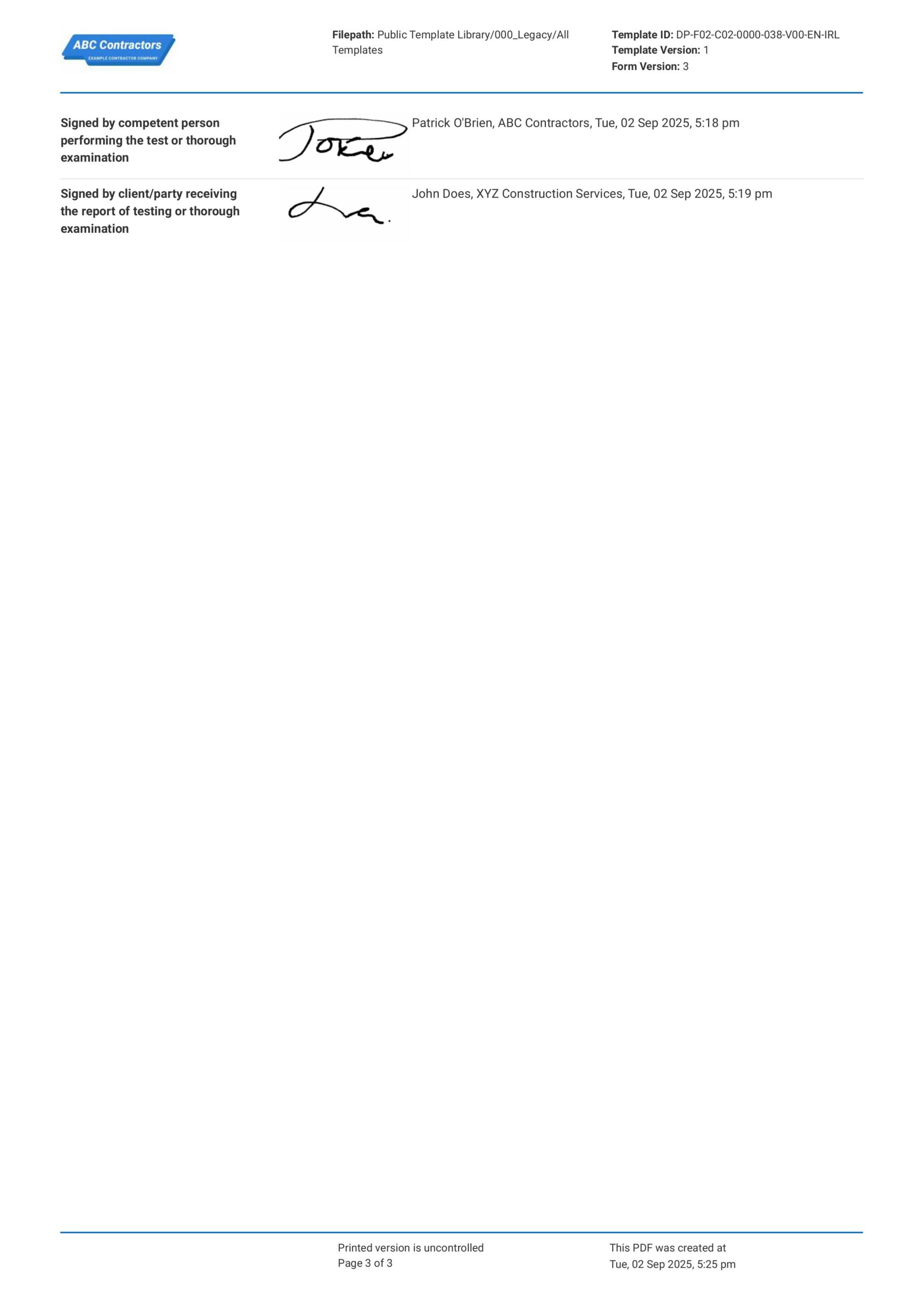 The Health and Safety Authority (HSA) of Ireland issues a set of forms to standardize the safety inspection, documentation, and certification for the workplace and work equipment. More specifically, the Safety, Health and Welfare at Work (General Application) Regulations, 2007, require that work equipment—especially lifting equipment and pressure systems—must undergo thorough examinations and, if required, functional testing to ensure the safety of personnel and material that are being handled.