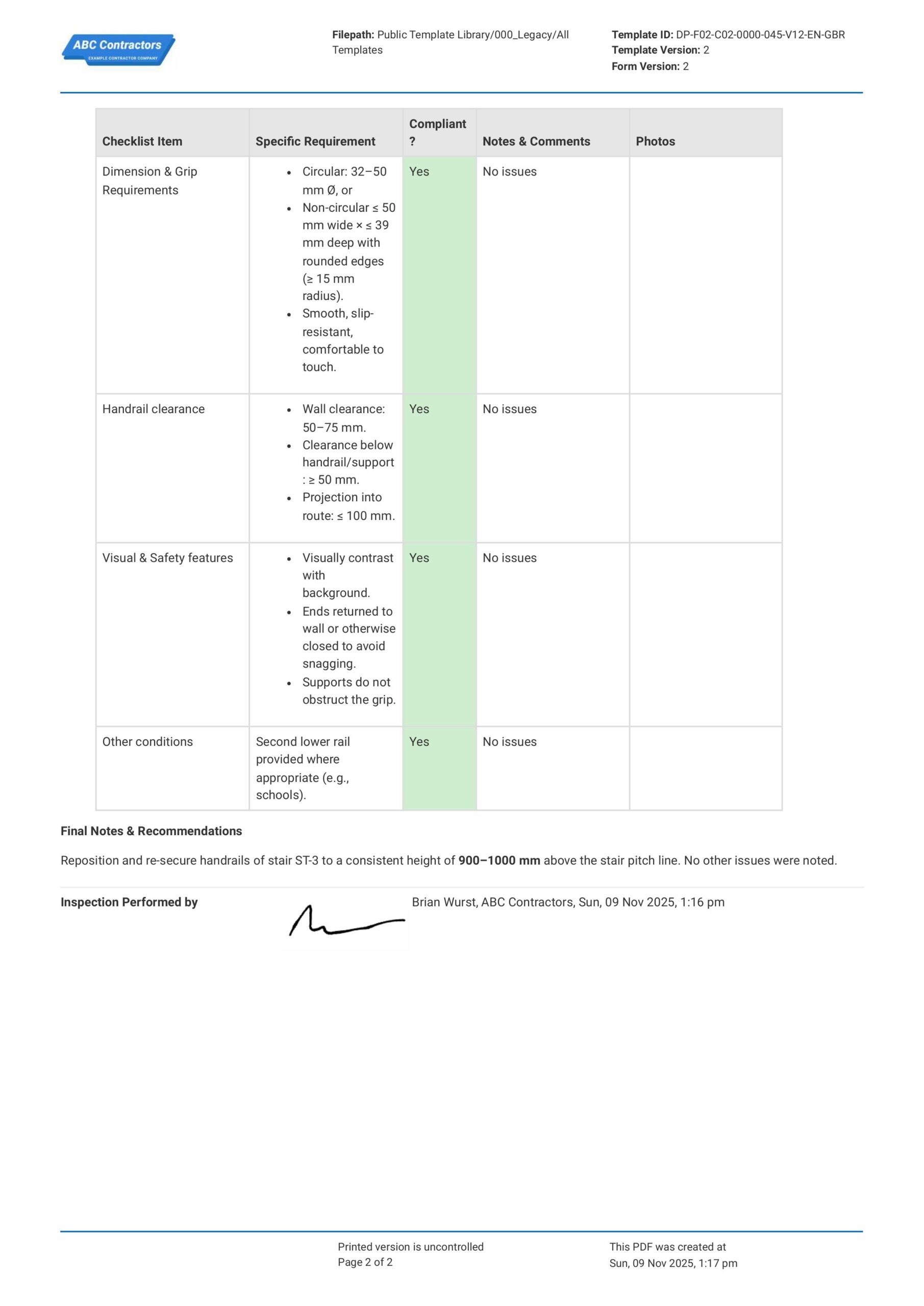 Part M Handrail Compliance Checklist Template